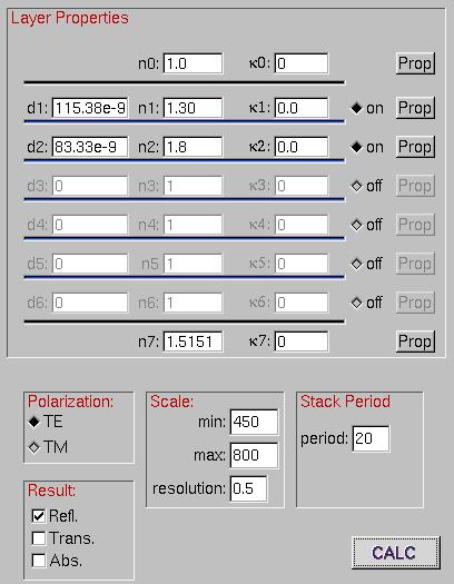 Here we simulate two quarter wave layers, one with low index n1= 1.30 and one with